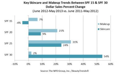 When it came to skincare, the majority of the growth occurred where the SPF was greater than 20. In particular, SPF 30, the second largest SPF segment in skincare at 13 percent of sales, grew significantly in the past 12 months ending May 2013. Sun protection products at the highest SPF levels of SPF 50 grew 24 percent from June 2012 to May 2013 and now account for almost one third of all in sun sales.